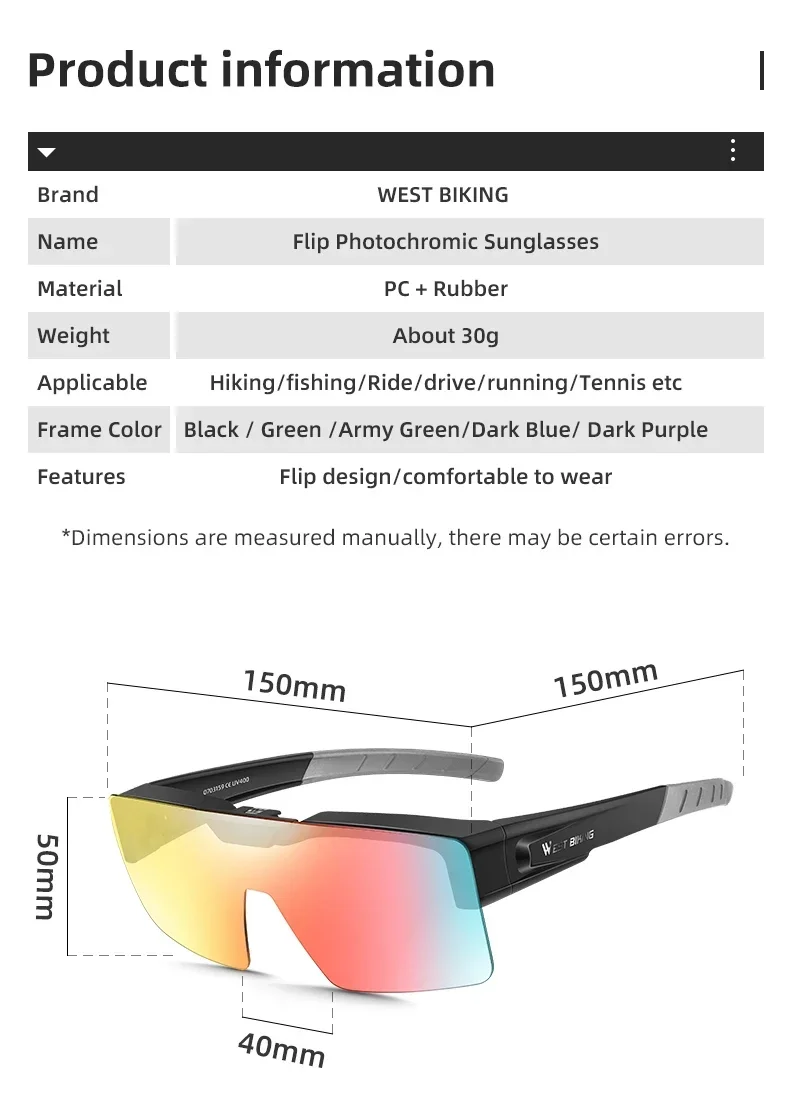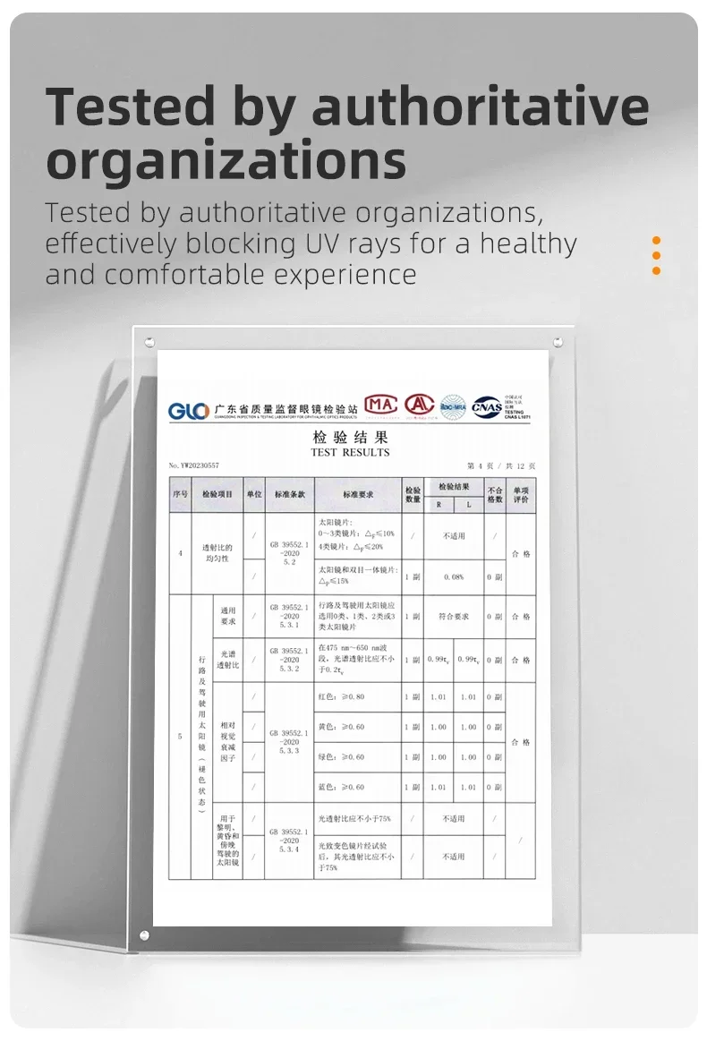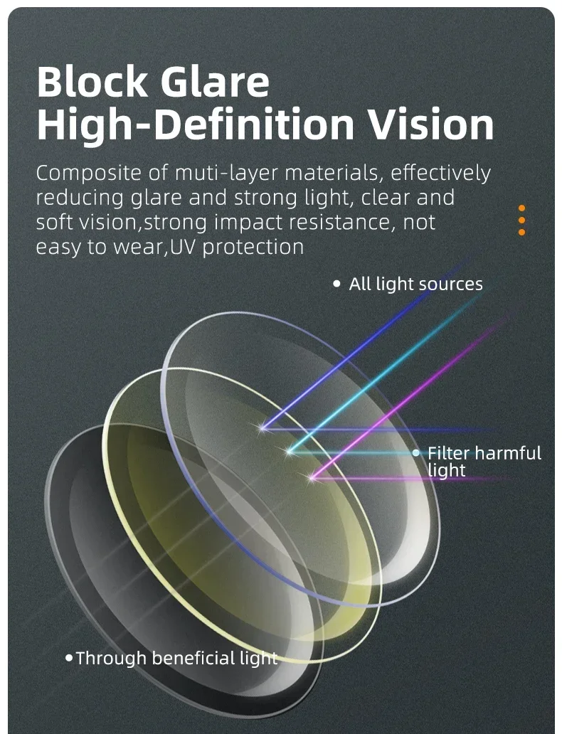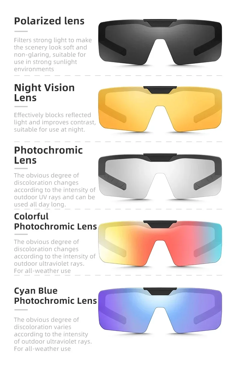Os quadros pretos correspondem ao laranja vermelho, quando o quadro verde do exército, o verde claro, o azul e o roxo corresponderem ao azul ciano, a profundidade das cores variar de acordo com a intensidade da luz exterior, tornando-o adequado para uso em todos os climas. As lentes coloridas são mais elegantes e bonitas.