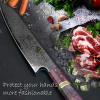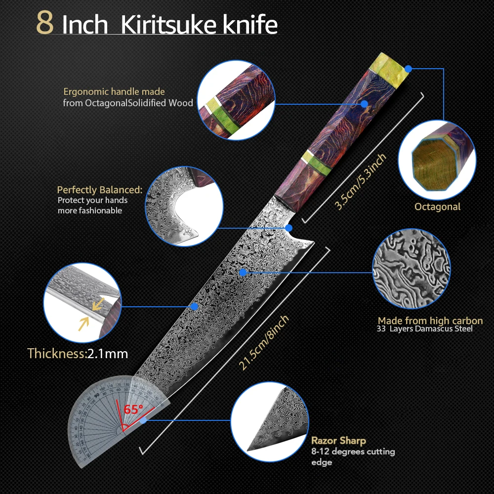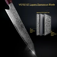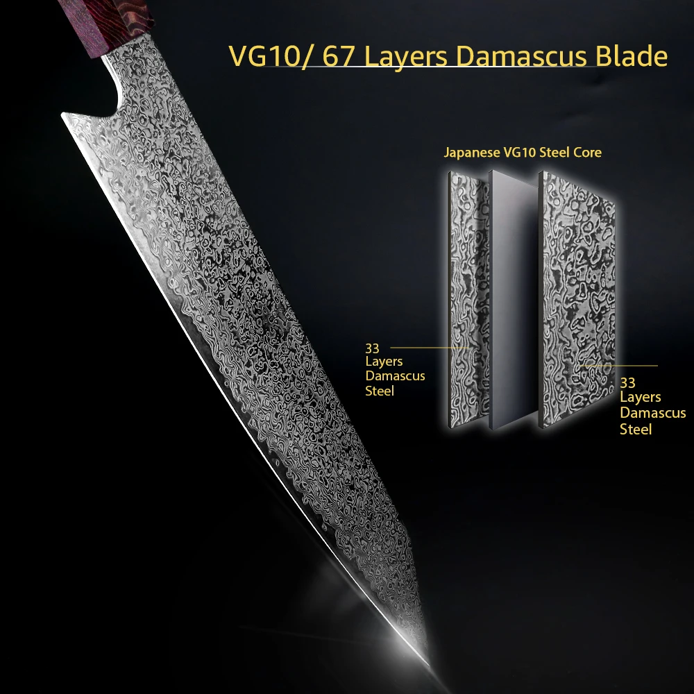 Faca japonesa com um alto teor de carbono uso VG 10 núcleo de corte 67 camadas damasco faca de aço 60-62 dureza, resfriamento a vácuo profundo torna resistentes à corrosão chefs facas com mão do espelho afiada borda V Taper Grinding, cada lado terra ângulo de 8-12 graus que oferece sua nitidez.
