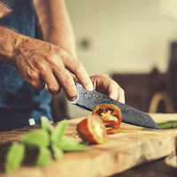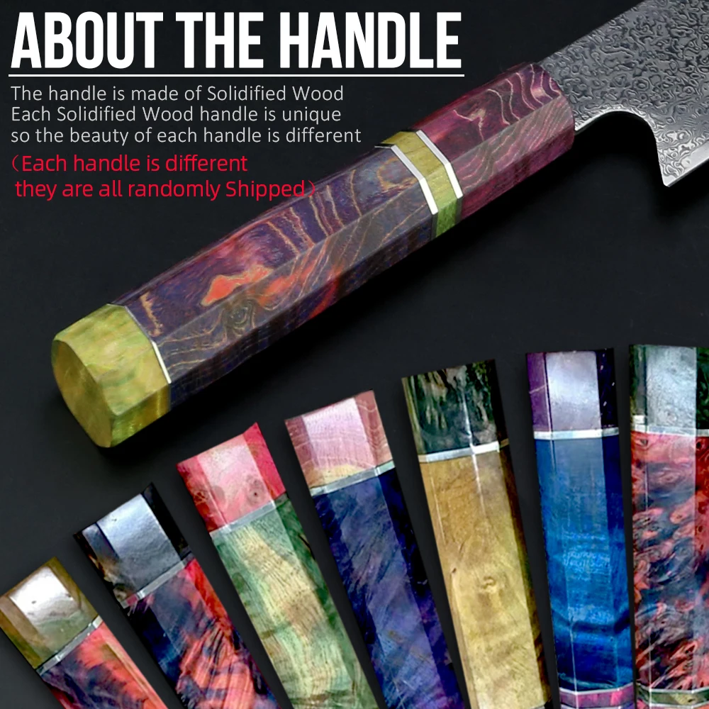 Esta faca de cozinha Damasco com cabo de madeira estável, cada um com seu padrão e cor únicos. Isso será uma surpresa.