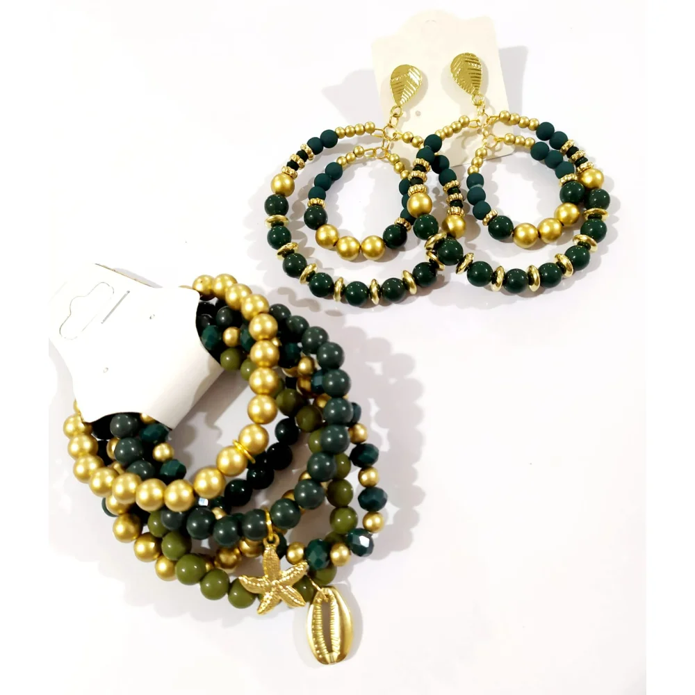 Cada produto é composto por 1 par de brinco e 6 pulseiras, igual a foto.