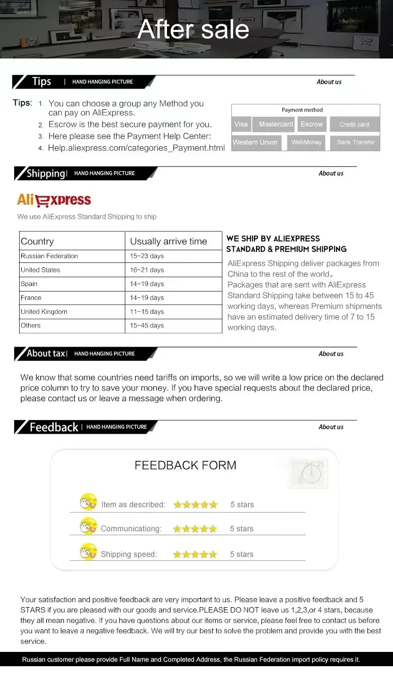 Estamos tentando o melhor para satisfazer nossos clientes. Esperamos sinceramente que você possa nos deixar um feedback positivo. Por qualquer motivo, você não estiver satisfeito com seu pedido, entre em contato conosco através de (Minhas Mensagens) ou (Fazer Perguntas ao Vendedor), Gerente de Comércio antes de deixar feedback neutro ou negativo. Faremos o nosso melhor para resolver quaisquer problemas e satisfazer suas necessidades.