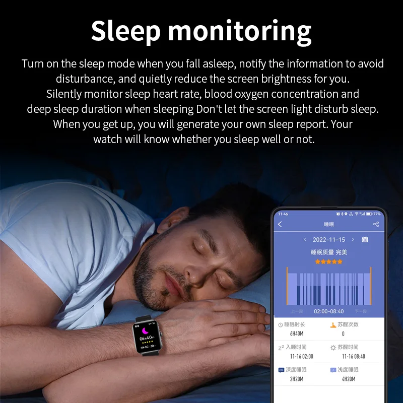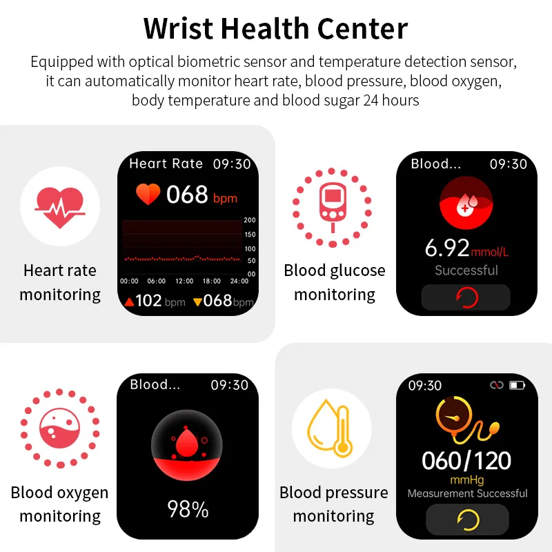 Contagem de passos, distância, calorias, frequência cardíaca, oxigênio no sangue, pressão arterial, açúcar no sangue, teste de temperatura corporal, monitoramento do sono reprodução de música, cronômetro, contagem regressiva, calculadora, exibição do tempo, função do período menstrual feminino, câmera de controle remoto, levantar o pulso para iluminar a tela, encontrar telefones celulares, etc., Lembrete de chamada recebida (número/nome do chamador), lembrete de mensagem, lembrete de despertador, lembrete sedentário, lembrete de alarme de frequência cardíaca, lembrete de desconexão Bluetooth (requer que o APP seja ativado), etc. Multi-dial: 3 mostradores padrão + 1 mostrador do mercado + 1 relógio personalizado enfrenta