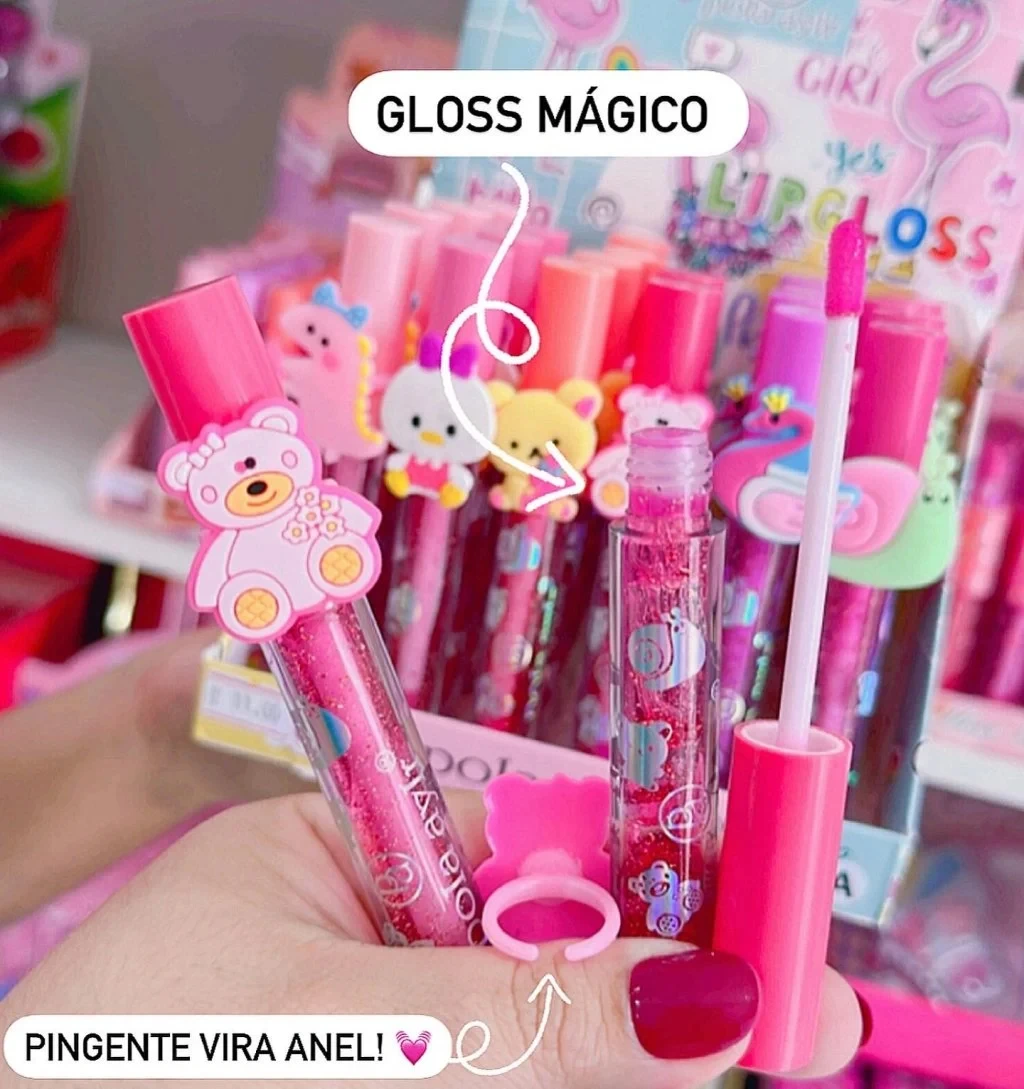 Lip gloss mágico hidratante infantil com brilho, acompanha anel de bichinhos super fofinhos!