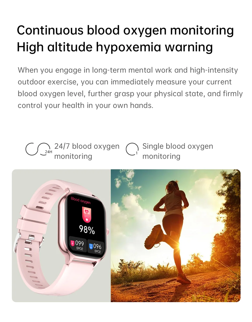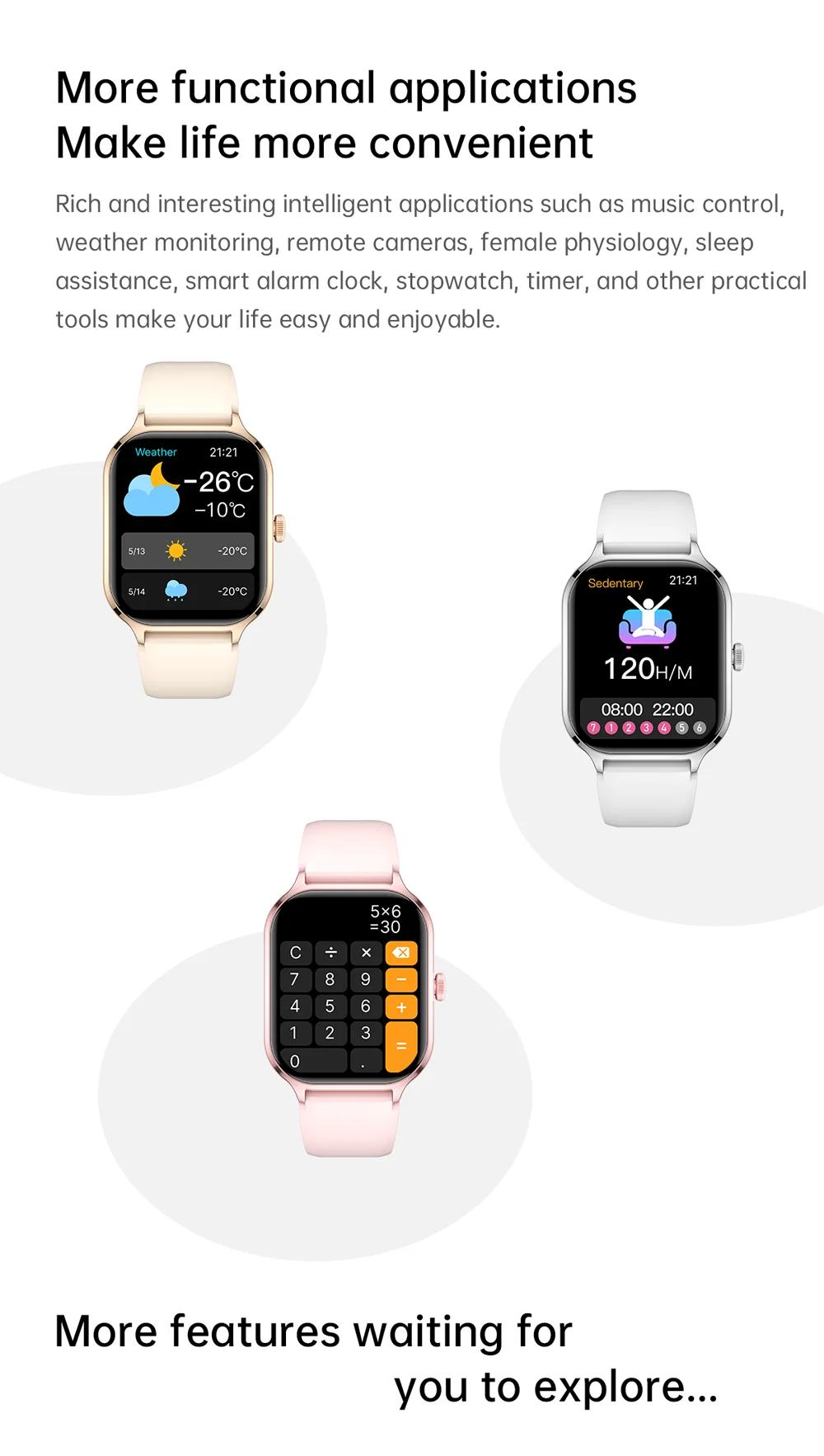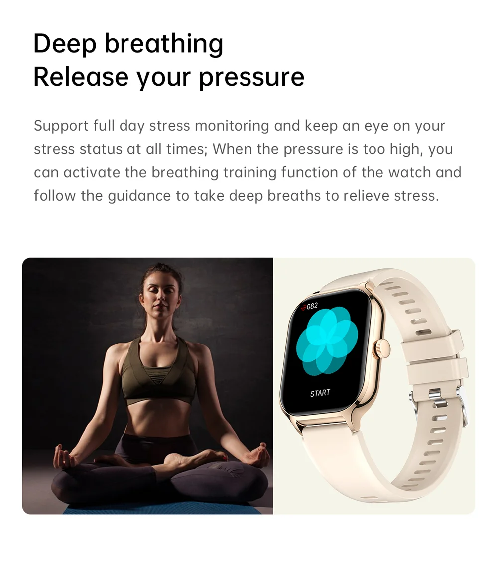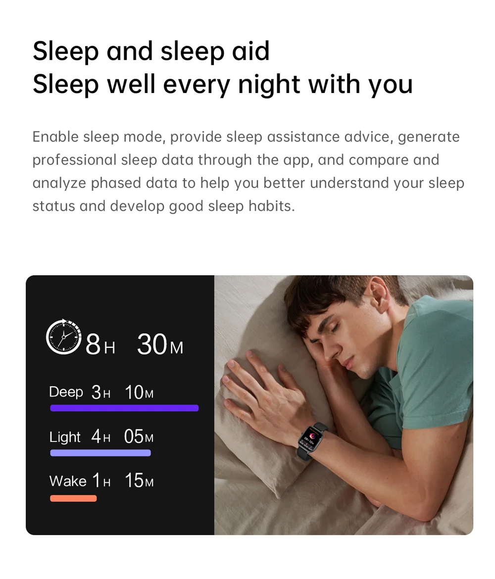 Contagem de passos, distância, calorias, monitoramento do sono, monitoramento da frequência cardíaca, pressão arterial, oxigênio no sangue, pesquisa do dispositivo, troca de idioma, levantando a mão para iluminar a tela.