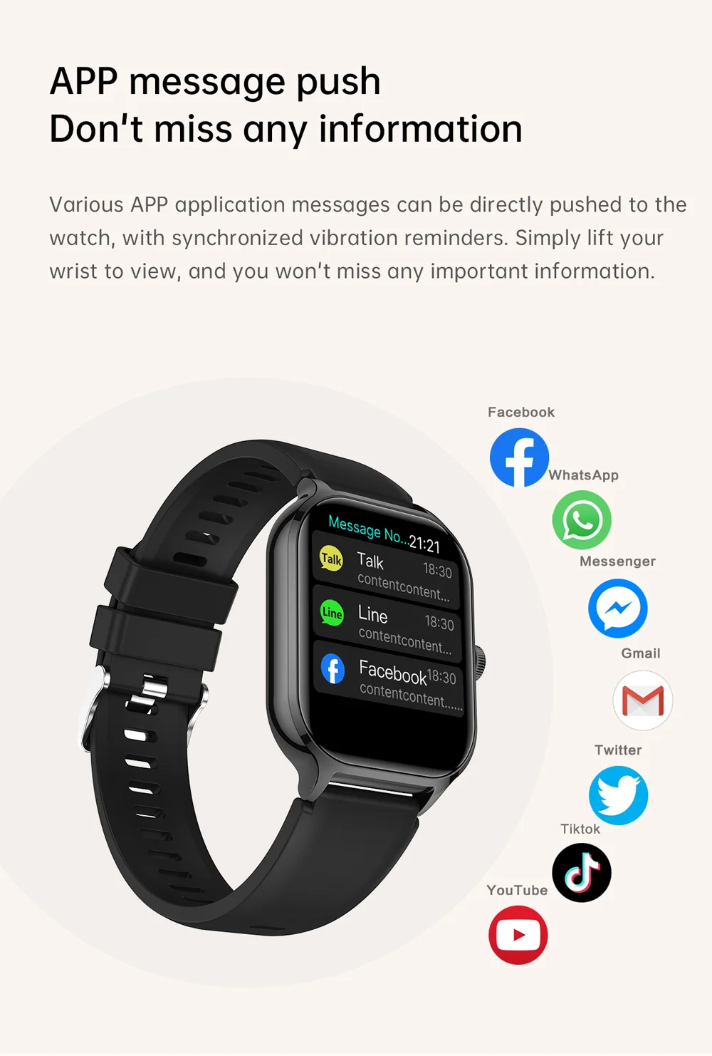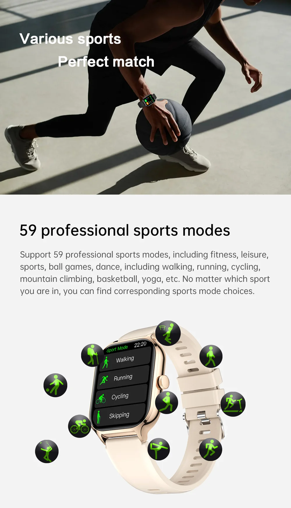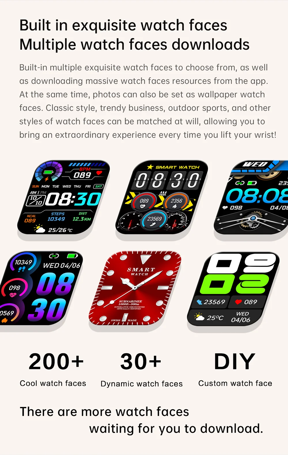 Contagem de passos, distância, calorias, monitoramento do sono, monitoramento da frequência cardíaca, pressão arterial, oxigênio no sangue, pesquisa do dispositivo, troca de idioma, levantando a mão para iluminar a tela.