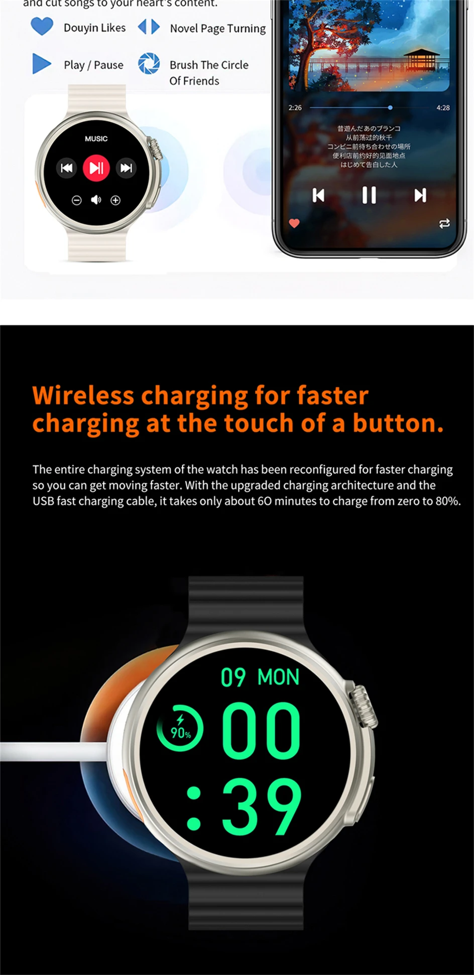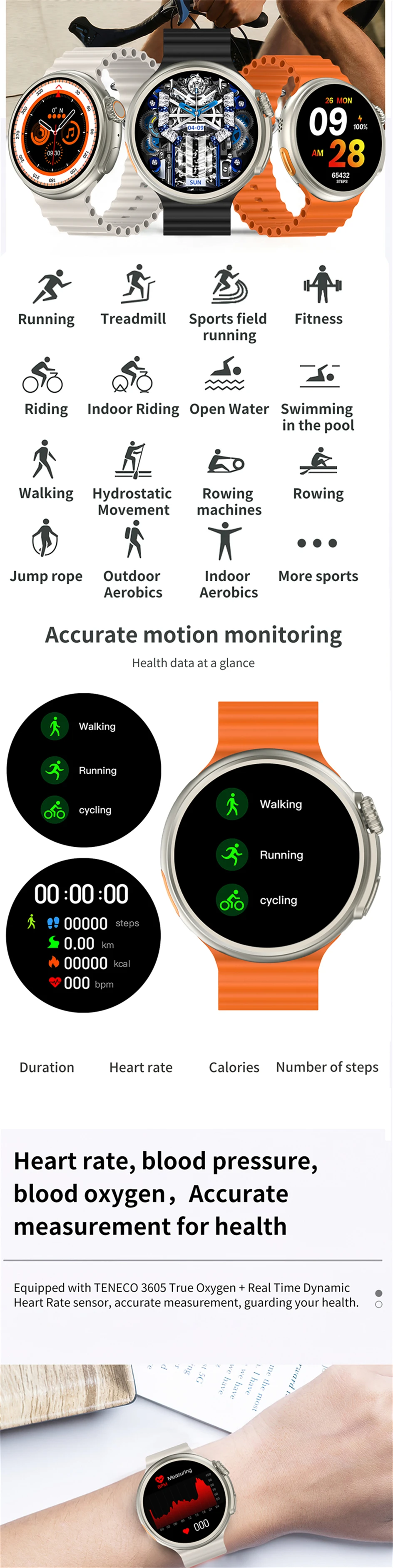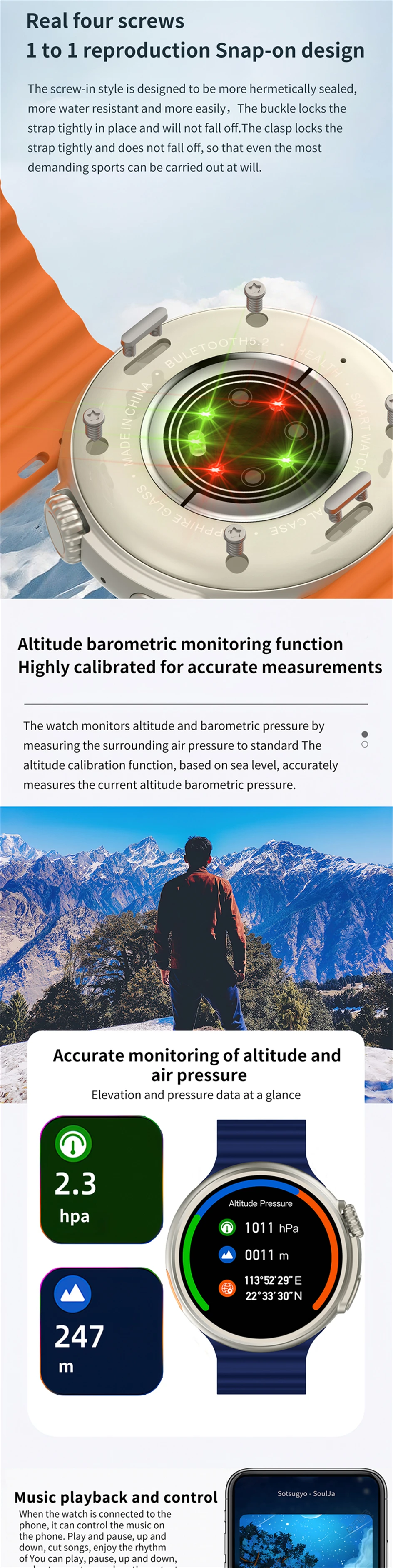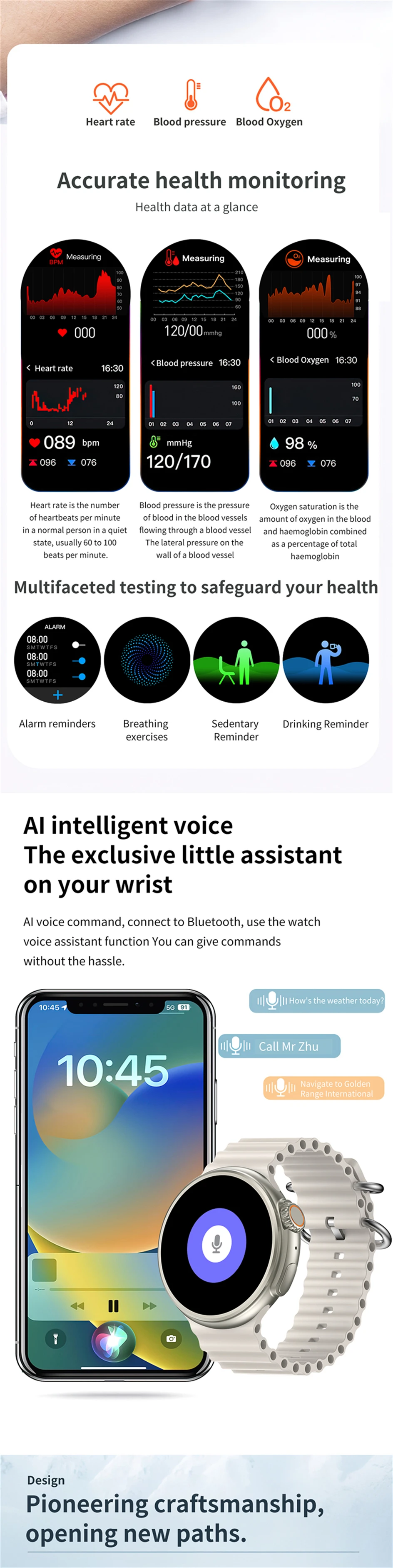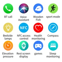 Smart Island, Pressão do ar, Bússola, Acesso NFC, Assistente de voz AI, Chamada Bluetooth (chamada de discagem e resposta), Mostrador personalizado do relógio, Vários mostrador do relógio no aplicativo, 5 conjuntos de estilo UI, passo, distância, calorias, monitoramento de saúde (freqüência cardíaca/pressão arterial/monitor de oxigênio no sangue), termômetro, música bluetooth, monitor de sono, chamada/lembrete sms, notificação de mensagem, Whatsapp,Facebook, Cronômetro, Tempo, Vários modos esportivos, Jogo, Peixe de madeira, Câmera remota, Cronômetro, Procurando telefone
